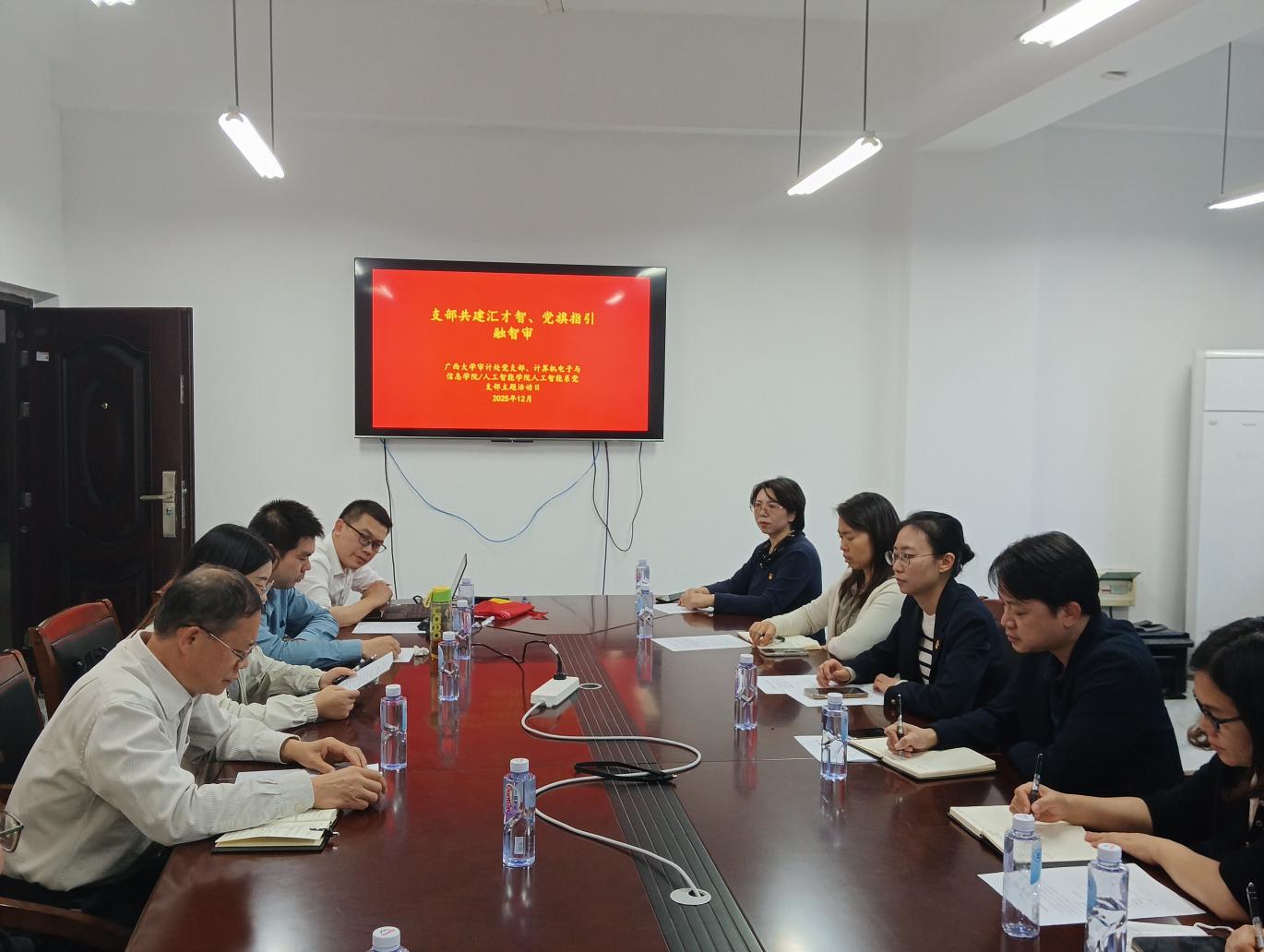 为深入贯彻落实新时代党的建设总要求,扎实推进“一融双高”示范项目建设,推动党建工作与业务工作深度融合、相互促进,12月9日下午,广西大学计算机与电子信息学院人工智能系党支部与审计处党支部联合开展“支部共建汇才智,党旗指引融智审”主题党日活动。