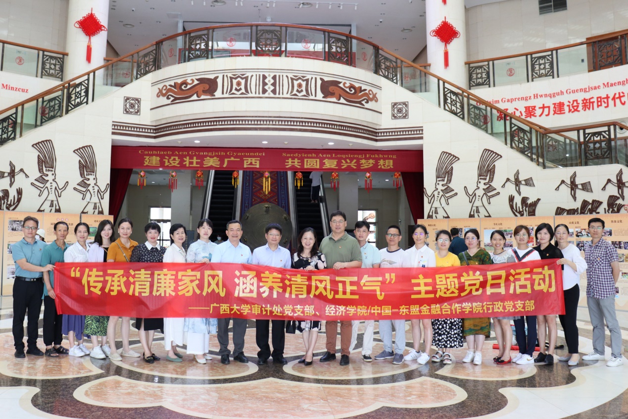 为深入学习贯彻习近平总书记关于家庭家教家风建设的重要论述和关于家庭教育的重要指示精神, 贯彻落实《广西大学推进“清廉西大”建设实施方案》的部署要求,引导党员教师加强家教家风治理,用良好家风建设助推党风廉政建设, 6月28日上午,广西大学审计处党支部与经济学院/中国—东盟金融合作学院教工行政党支部前往广西民族博物馆参观“家和万事兴——广西家庭家教家风主题展”,开展支部共建“传承清廉家风 涵养清风正气”主题党日活动。经济学院/中国—东盟金融合作学院党委书记陆善勇、我处支部书记谭银花以及经济学院/中国—东盟金融合作学院教工行政党支部和我处党支部的全体党员近30人参加了本次活动。