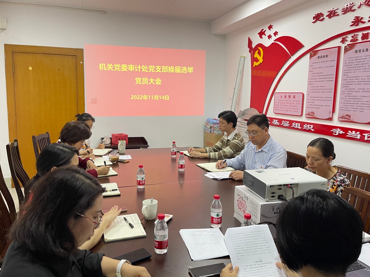 11月14日下午,审计处党支部在君武楼303会议室召开全体党员大会,进行新一届支部委员会换届选举工作。大会由付文科副处长主持,审计处民盟盟员梁菲同志列席本次大会。